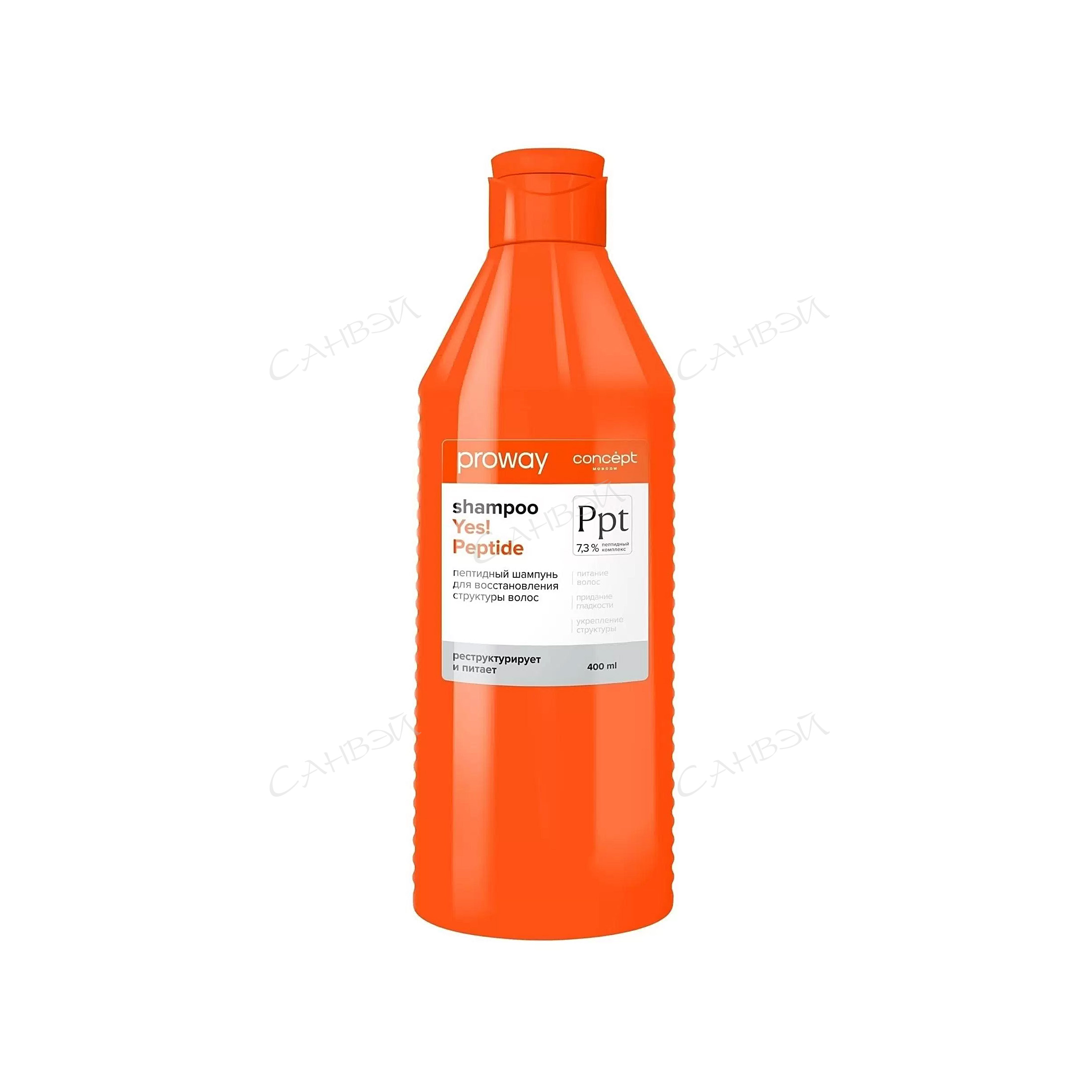 Concept Шампунь для восстановления структуры волос ProWay с пептидами 400 мл реструктурирует и укрепляет структуру ломких, секущихся и поврежденных волос, делая их более плотными сильными и здоровыми. Шампунь Yes! Peptide, обогащенный пептидным комплексом, аргинином и фосфолипидами, деликатно и эффективно очищает кожу головы и волосы.<