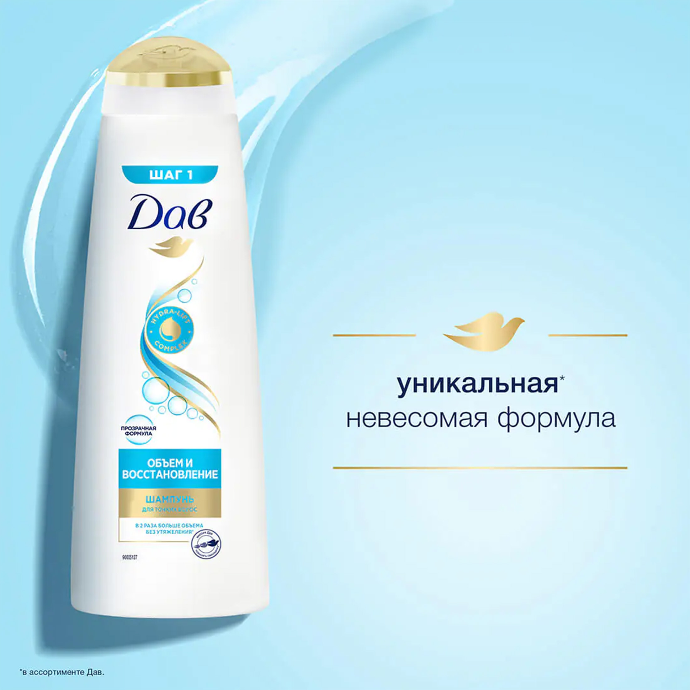Серия Дав Hair Therapy Объем и восстановление сделает ваши волосы в два раза объемнее, не утяжеляя их! Продукты серии специально разработаны с учетом потребностей тонких и ослабленных волос. Шампунь Объем и восстановление работает сразу в 2-х направлениях, чтобы максимально наполнить жизненной силой тонкие и потерявшие жизненную силу волосы. Уникальная невесомая формула с комплексом Hydra-Lift придает волосам дополнительный объем, воздействуя от самых корней, при этом мягко питает их. Формула шампуня эффективно действует на всей поверхности волоса, мгновенно разглаживая его, поддерживает необходимый уровень питания и дополнительного увлажнения. Данная технология позволит вашим волосам выглядеть гладкими, объемными и ухоженными!