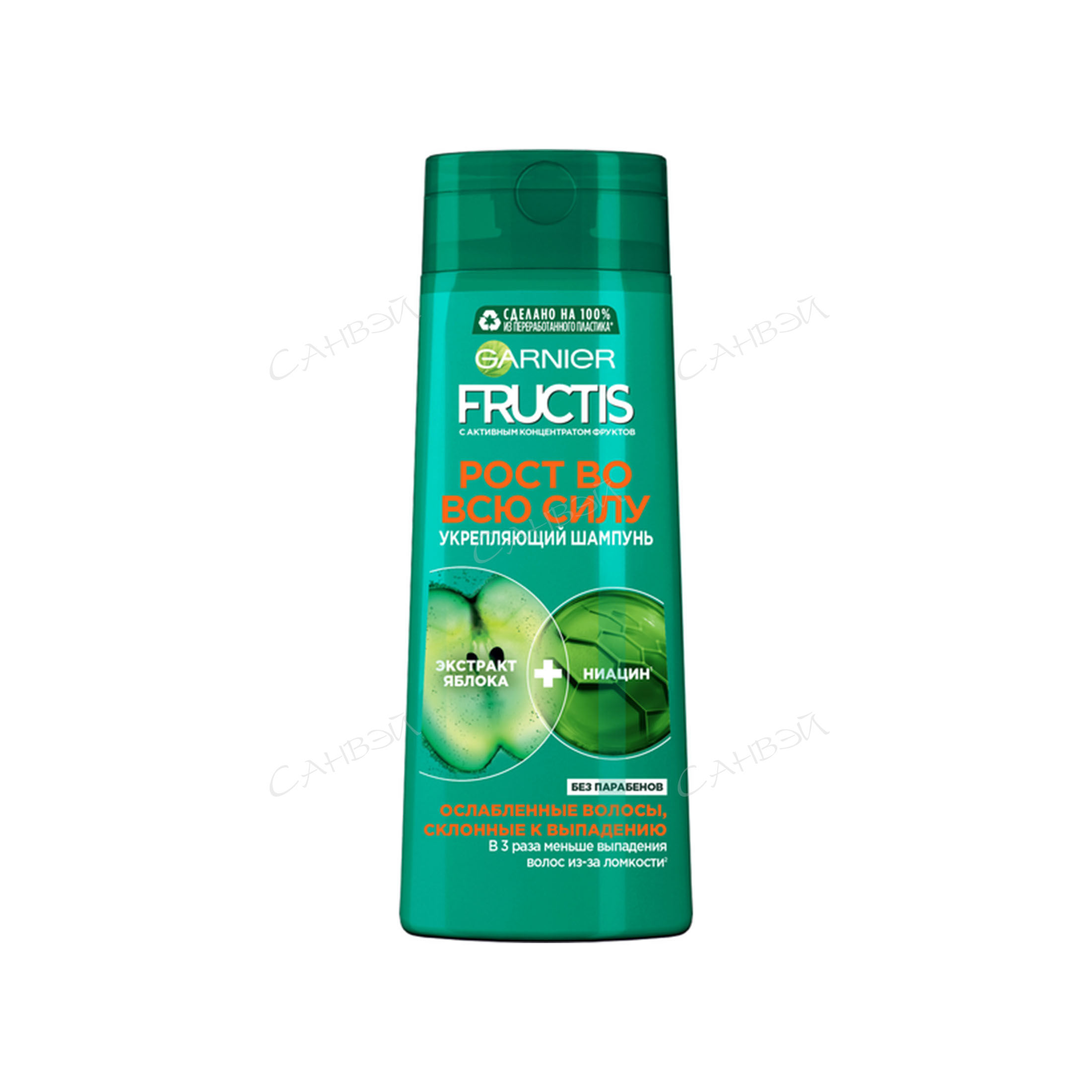 Слабые, хрупкие волосы? Fructis представляет систему усиления, которая сочетает в себе суперфрукт натурального происхождения с активными ингредиентами. Ваши волосы выглядят более здоровыми и сильными. Шампунь Рост Во Всю Силу обогащен двумя суперингредиентами: Экстрактом яблока и Ниацином, для придания волосам жизненной силы, сияния и восстановлении прочности волос. Доказано! Волосы становятся более прочными, стойкими и сияющими от корней до кончиков.