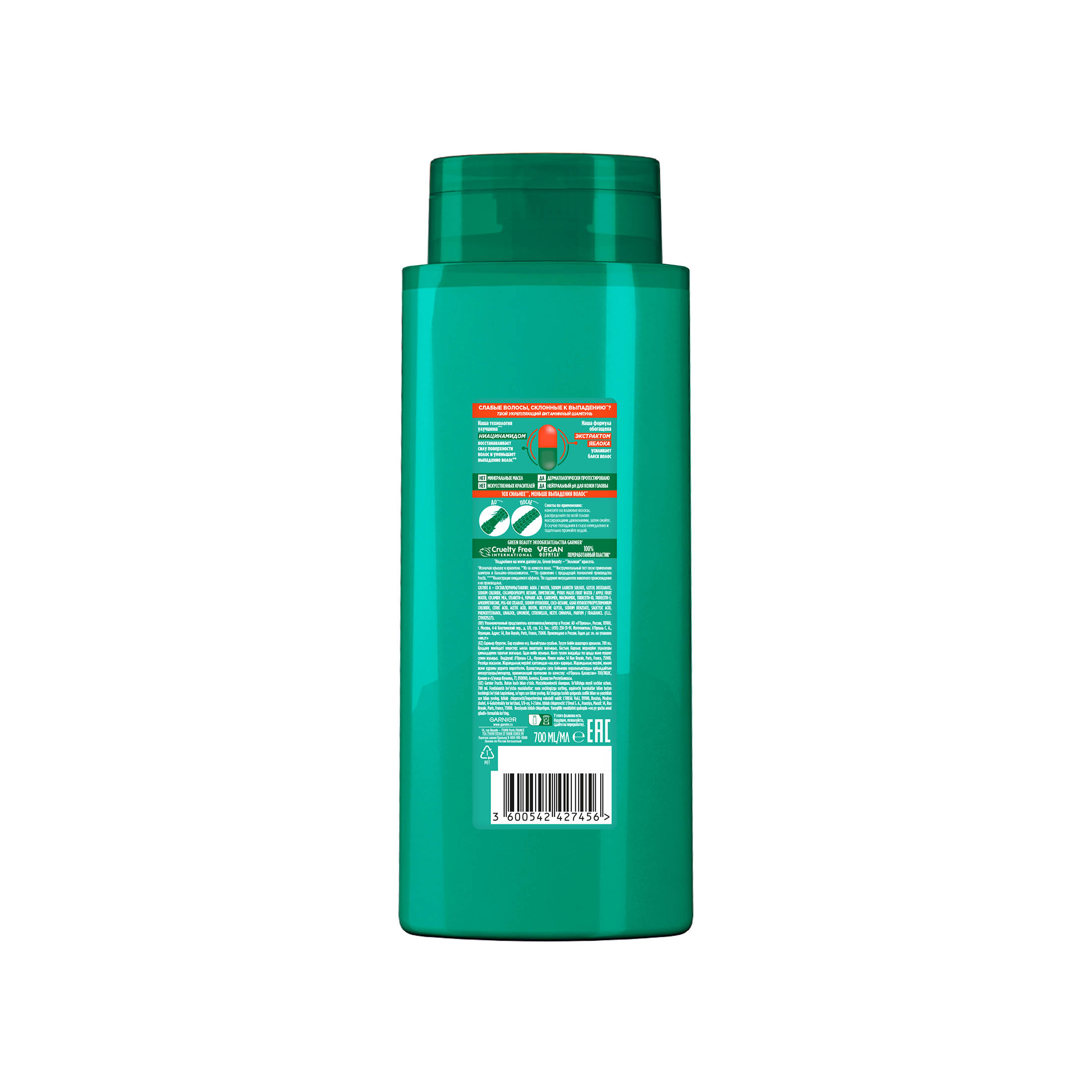 Garnier Fructis Укрепляющий шампунь Фруктис Рост во всю Силу для ослабленных волос, склонных к выпадению, 700 мл из Санвэй обогащен двумя суперингредиентами: Экстрактом яблока и Ниацином, для придания волосам жизненной силы, сияния и восстановлении прочности волос. Доказано! Волосы становятся более прочными, стойкими и сияющими от корней до кончиков.