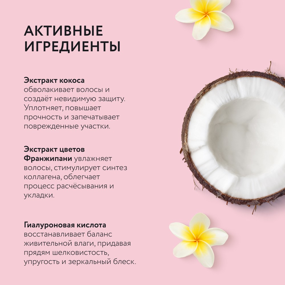 - Экстракт кокоса обволакивает пряди и создаёт невидимую защиту. Уплотняет, повышает прочность и запечатывает повреждённые участки.