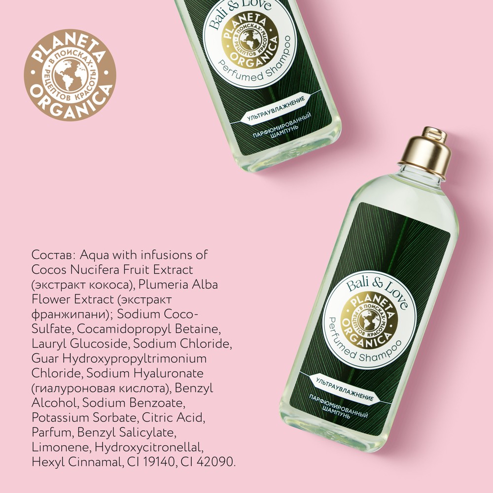 Aqua with infusions of Cocos Nucifera Fruit Extract (экстракт кокоса), Plumeria Alba Flower Extract (экстракт франжипани); Sodium Coco-Sulfate, Cocamidopropyl Betaine, Lauryl Glucoside, Sodium Chloride, Guar Hydroxypropyltrimonium Chloride, Sodium Hyaluronate (гиалуроновая кислота), Benzyl Alcohol, Sodium Benzoate, Potassium Sorbate, Citric Acid, Parfum, Benzyl Salicylate, Limonene, Hydroxycitronellal, Hexyl Cinnamal, CI 19140, CI 42090.