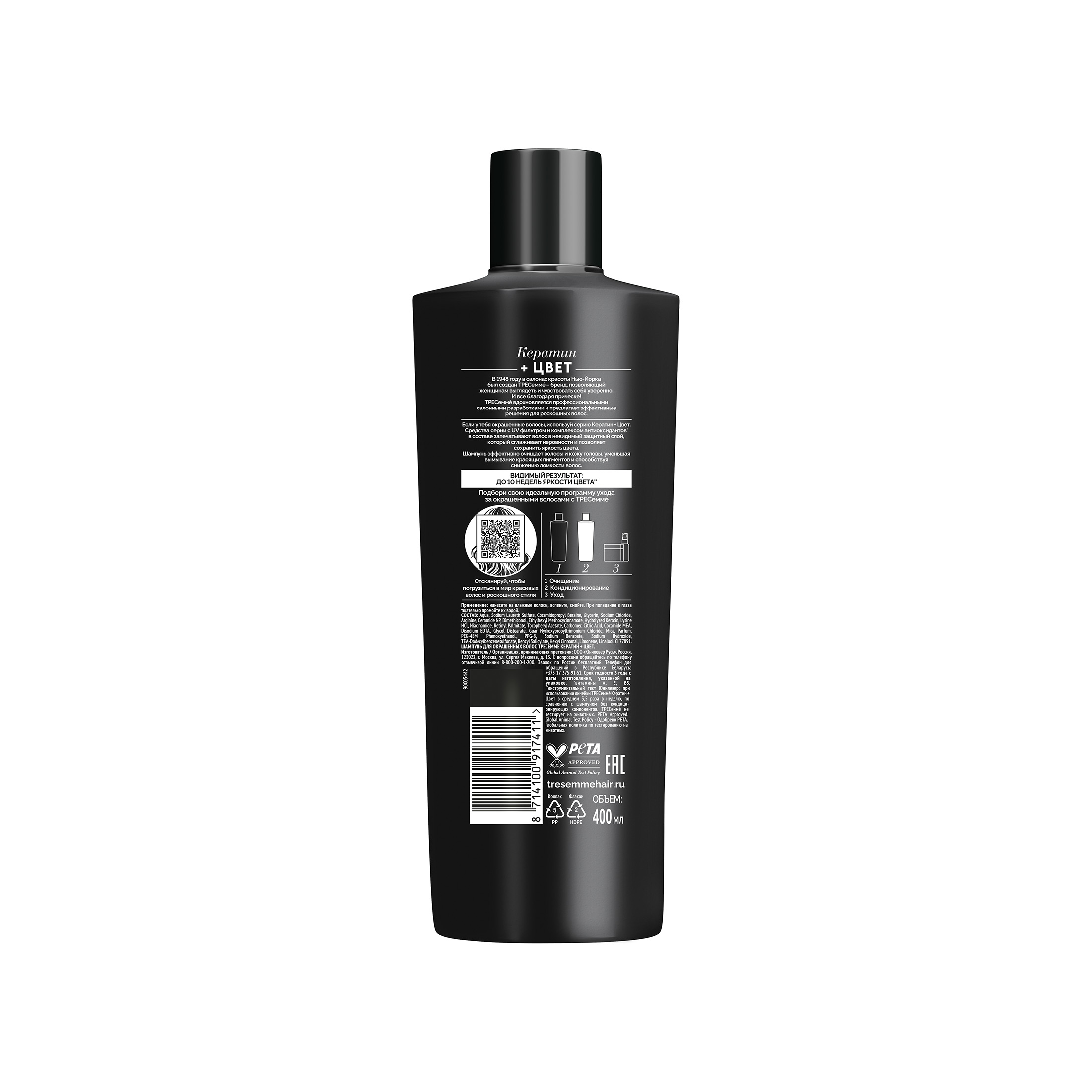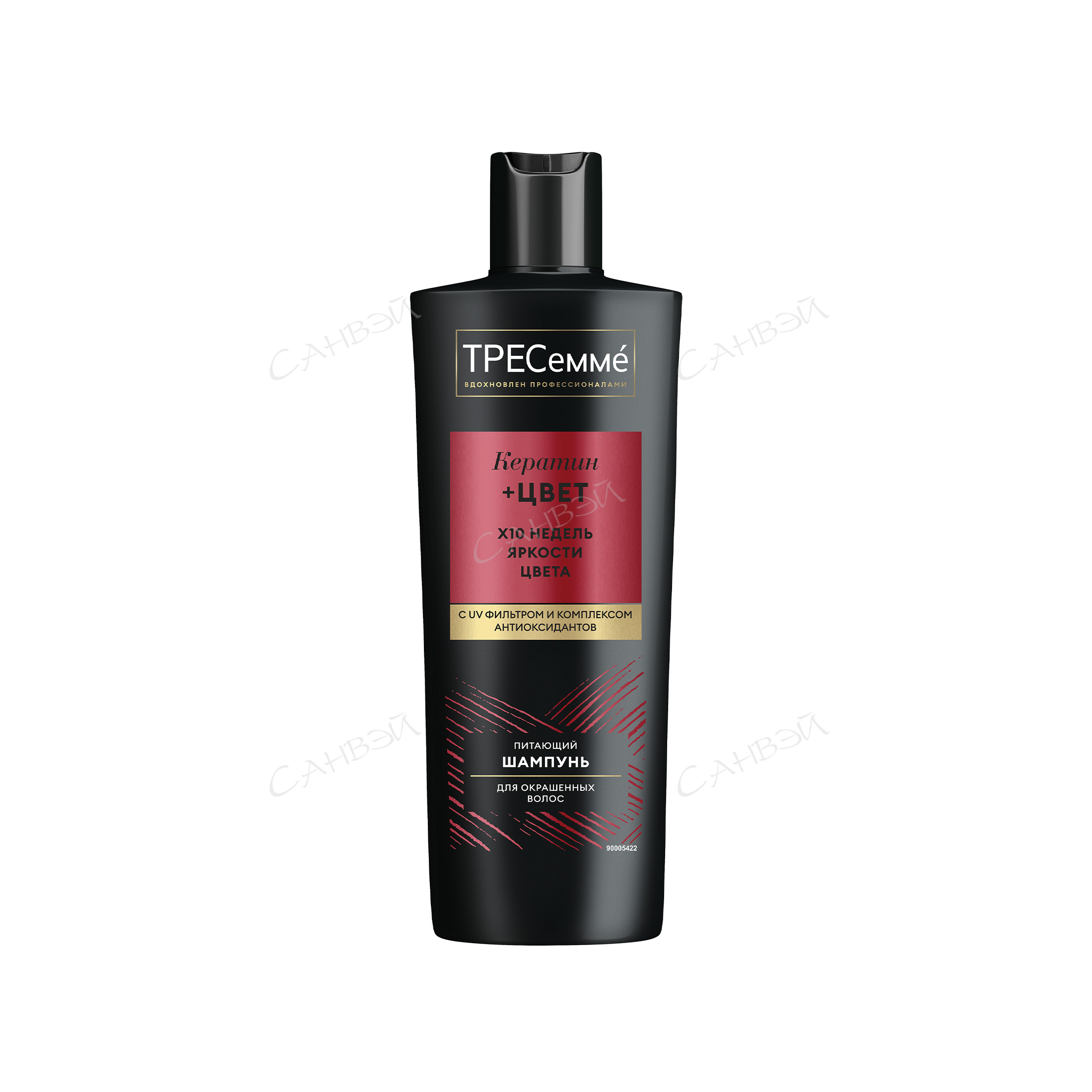ТРЕСеммé Кератин + Цвет 400 мл из Санвэй - шампунь для окрашенных волос, вдохновленный профессиональным уходом за волосами. Особая формула шампуня с UV фильтром и комплексом антиоксидантов ухаживает за волосами и дарит видимый результат: до 10 недель яркости цвета!