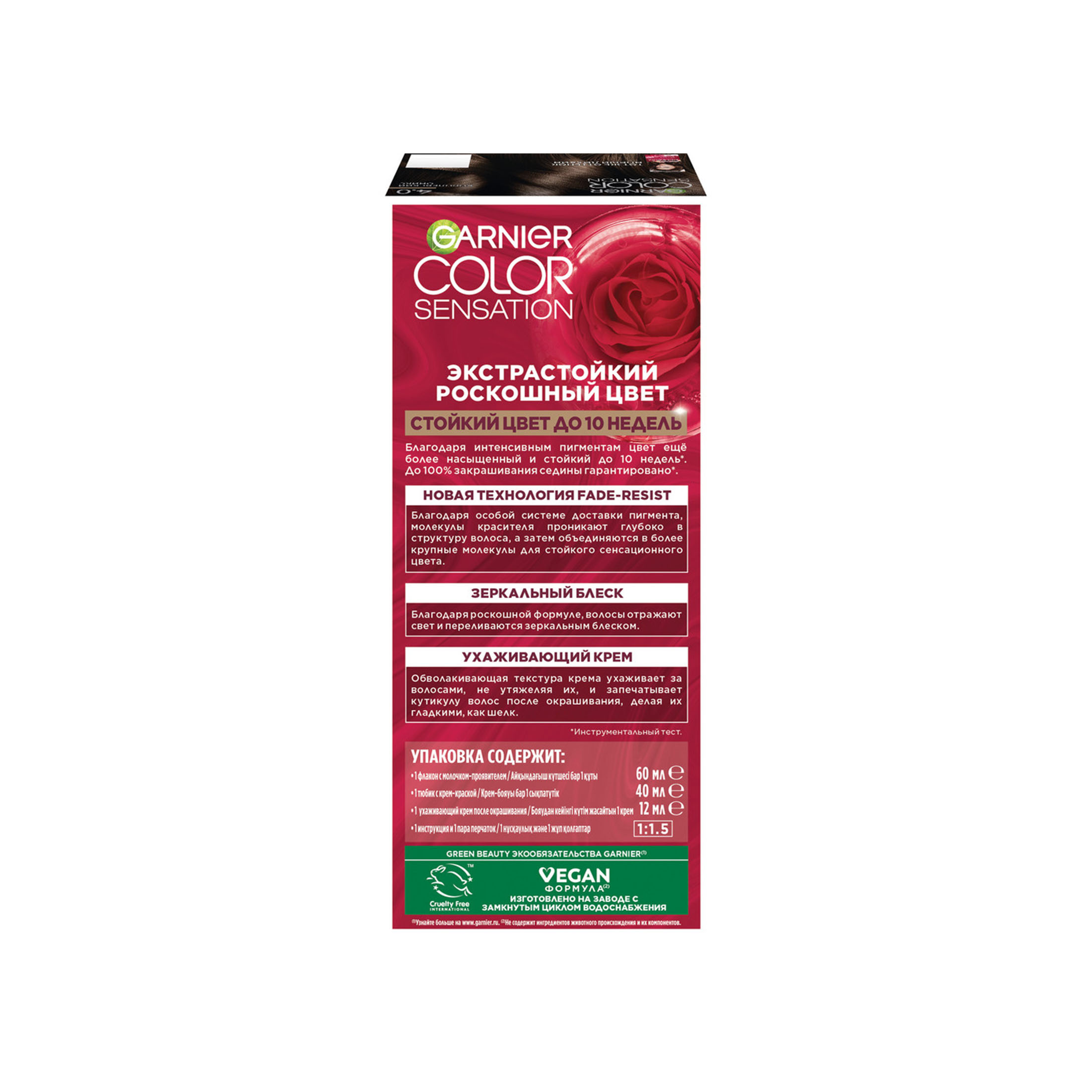Garnier Стойкая крем-краска для волос Color Sensation, оттенок 4.0 Королевский оникс, 112 мл из магазина Санвэй благодаря интенсивным пигментам и эссенции розы цвет еще более насыщенный и стойкий до 10 недель (Инструментальный тест), а волосы отражают свет и переливаются зеркальным блеском.