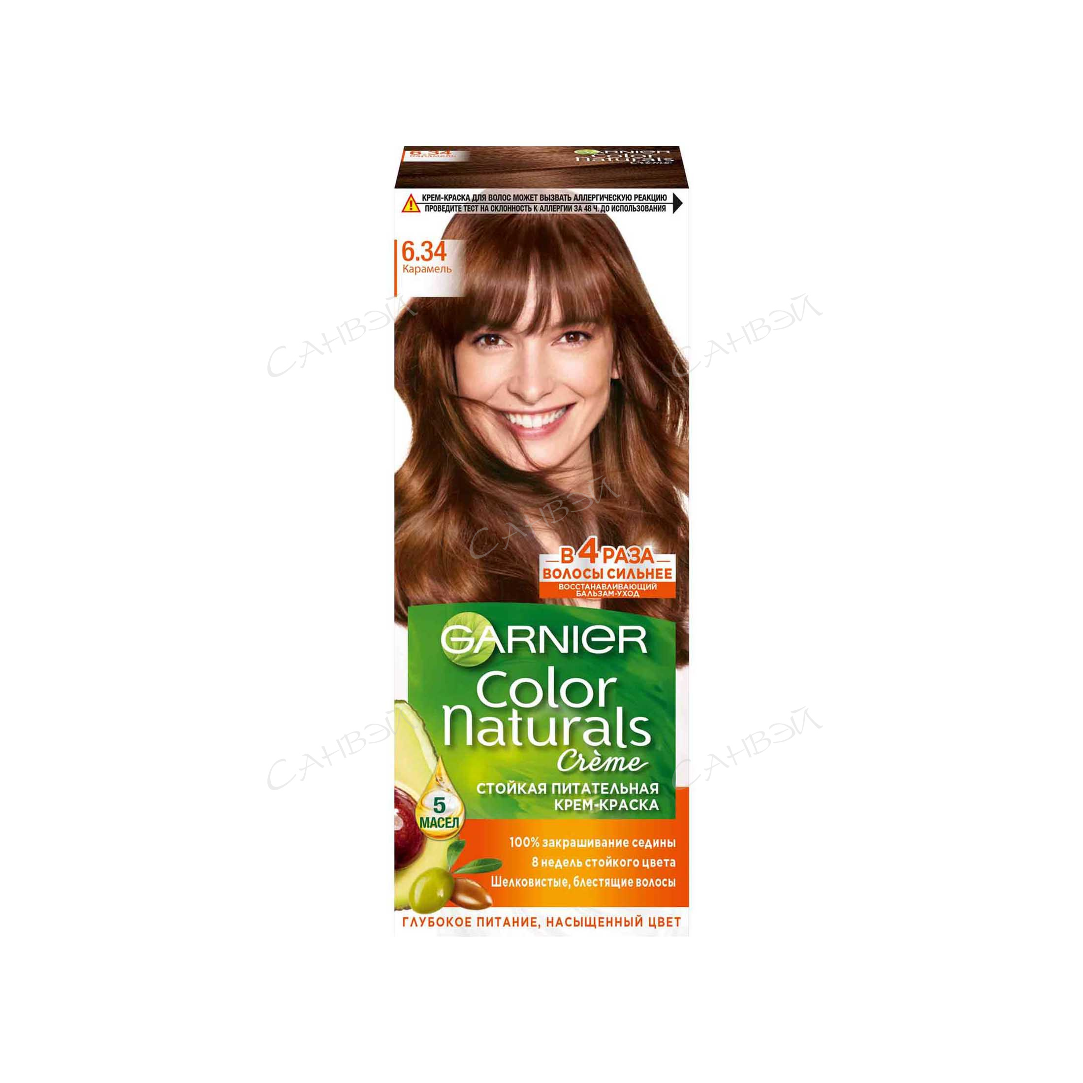 - Оттенок 6.34 Карамель от Garnier Color Naturals – роскошный темно-русый цвет с золотистым подтоном и мягкими медными переливами.