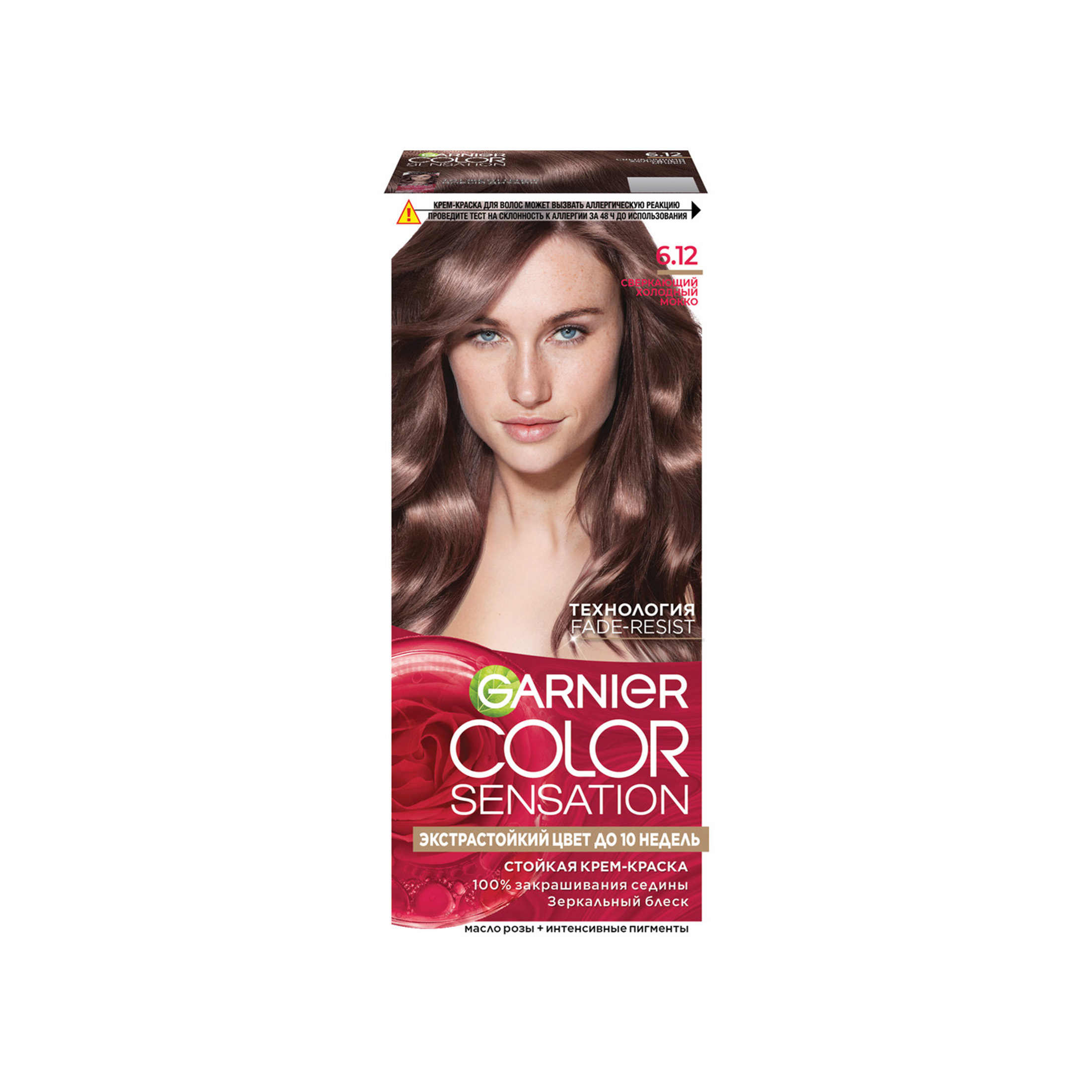 - Оттенок 6.12 Сверкающий холодный мокко Garnier Color Sensation – светло-каштановый цвет с холодным жемчужно-пепельным отливом.