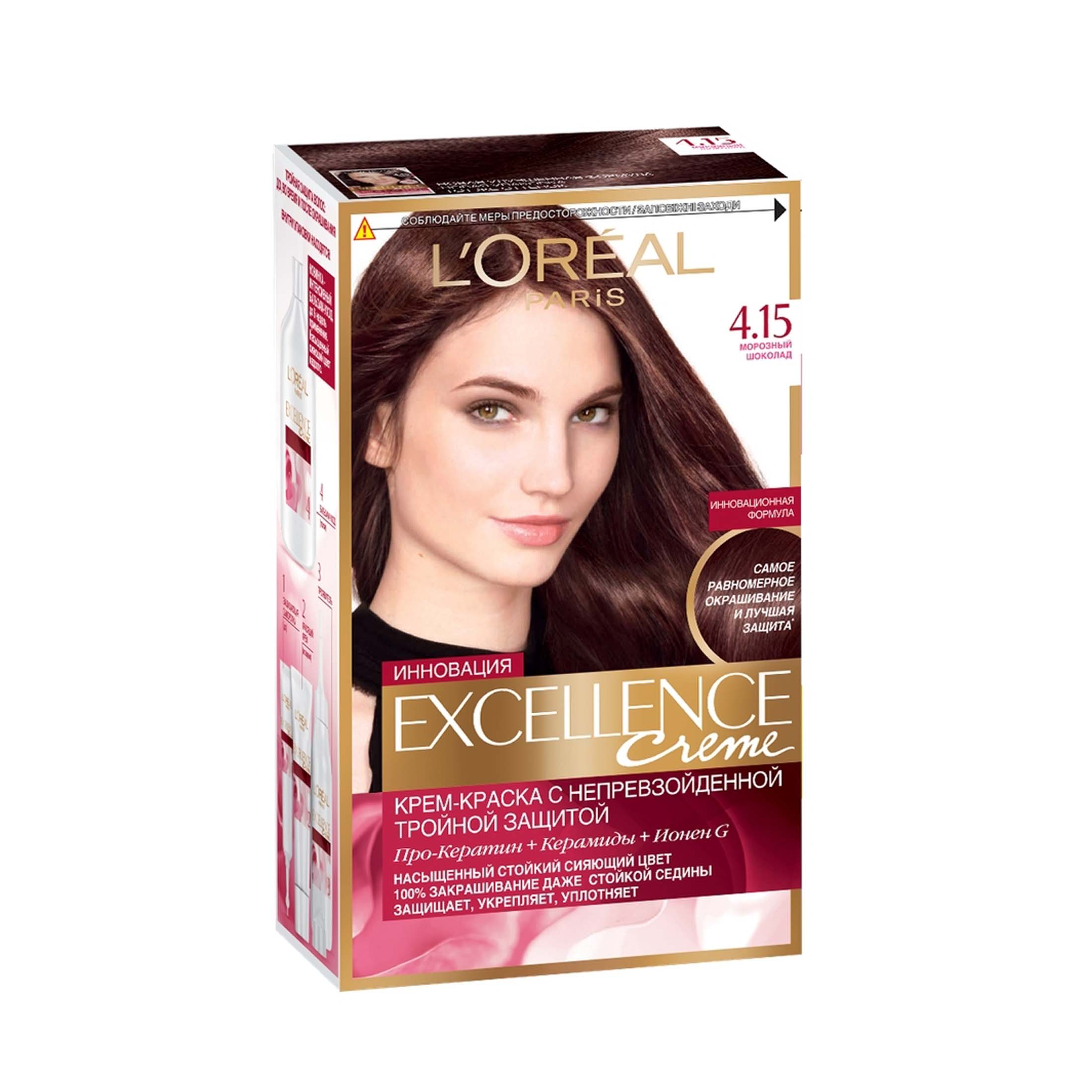 Стойкая инновационная крем-краска для волос L'Oreal Excellence, оттенок 4.15, морозный шоколад из магазина Санвэй с тройной защитой: уход за цветом, уход за кожей головы, уход за волосами. Локоны приобретают насыщенный живой цвет, который длительное время не смывается и не тускнеет.