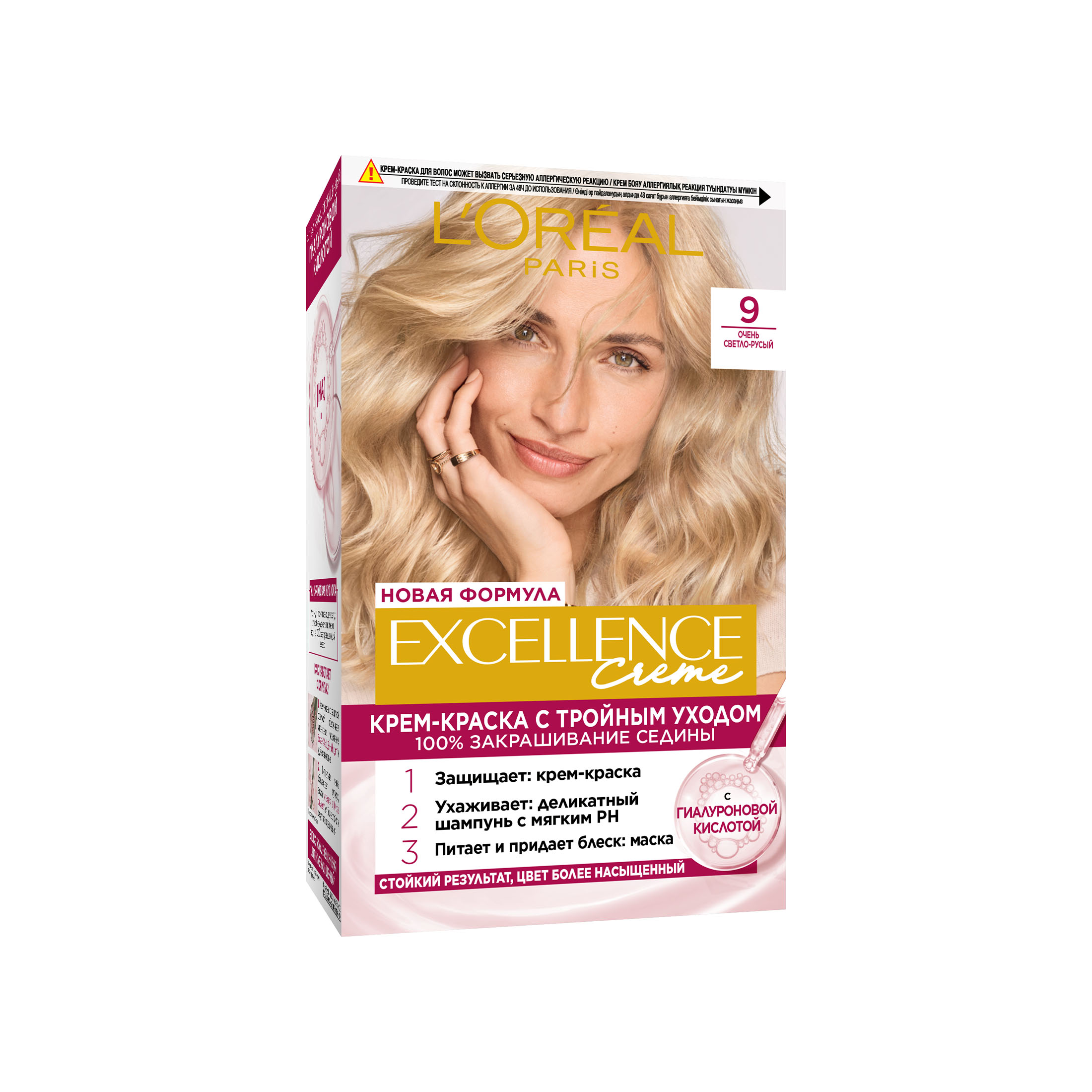 Стойкая инновационная крем-краска для волос L'Oreal Excellence, оттенок 9, очень светло-русый из магазина Санвэй защищает во время окрашивания. 100% закрашивание седины. Любой оттенок волос, в любое время, без тени беспокойства.