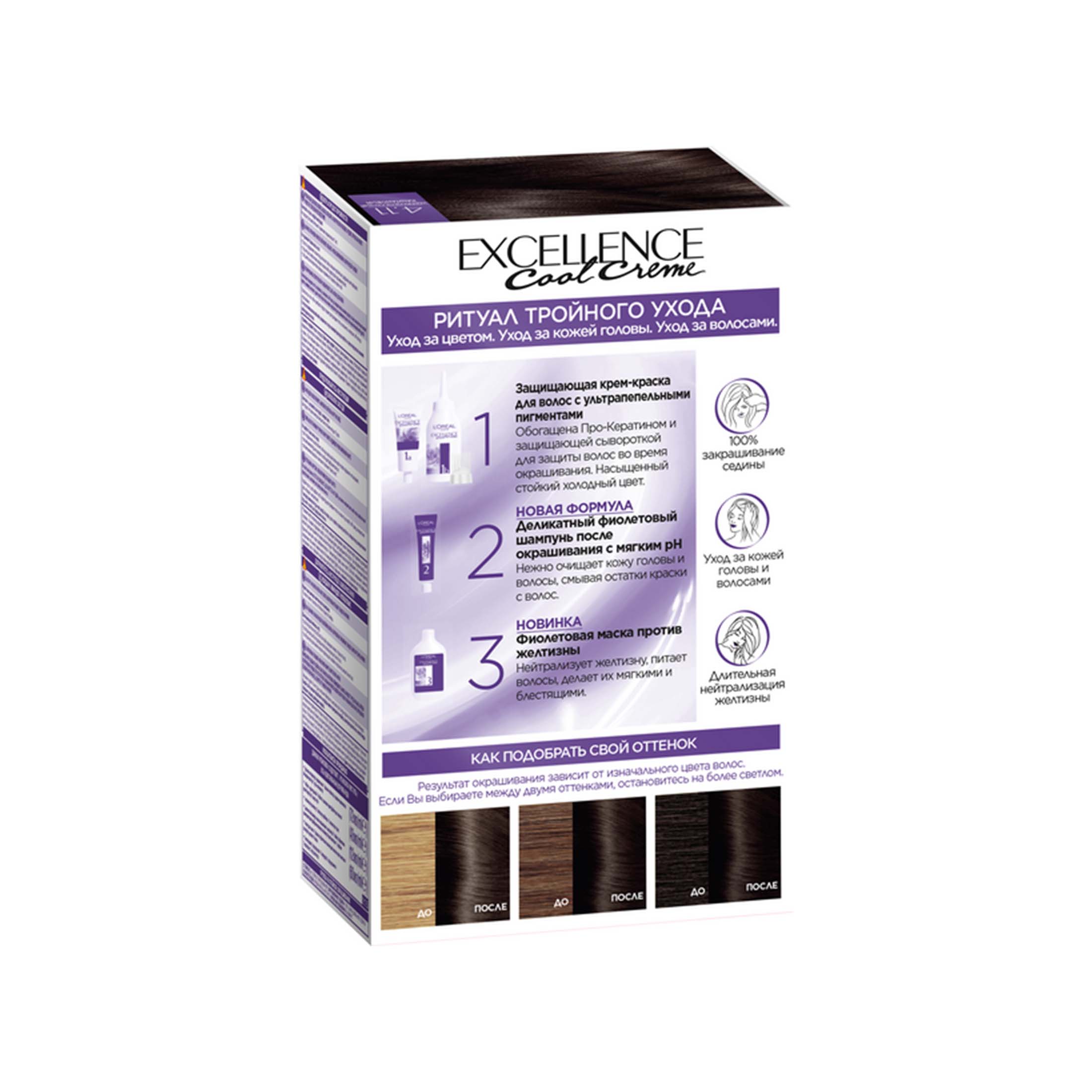 L’Oréal Paris Стойкая крем-краска для волос "Excellence Cool Crème", оттенок 4.11, Ультрапепельный, Каштановый из магазина Санвэй с тройной защитой: уход за цветом, уход за кожей головы, уход за волосами. Локоны приобретают насыщенный живой цвет, который длительное время не смывается и не тускнеет.