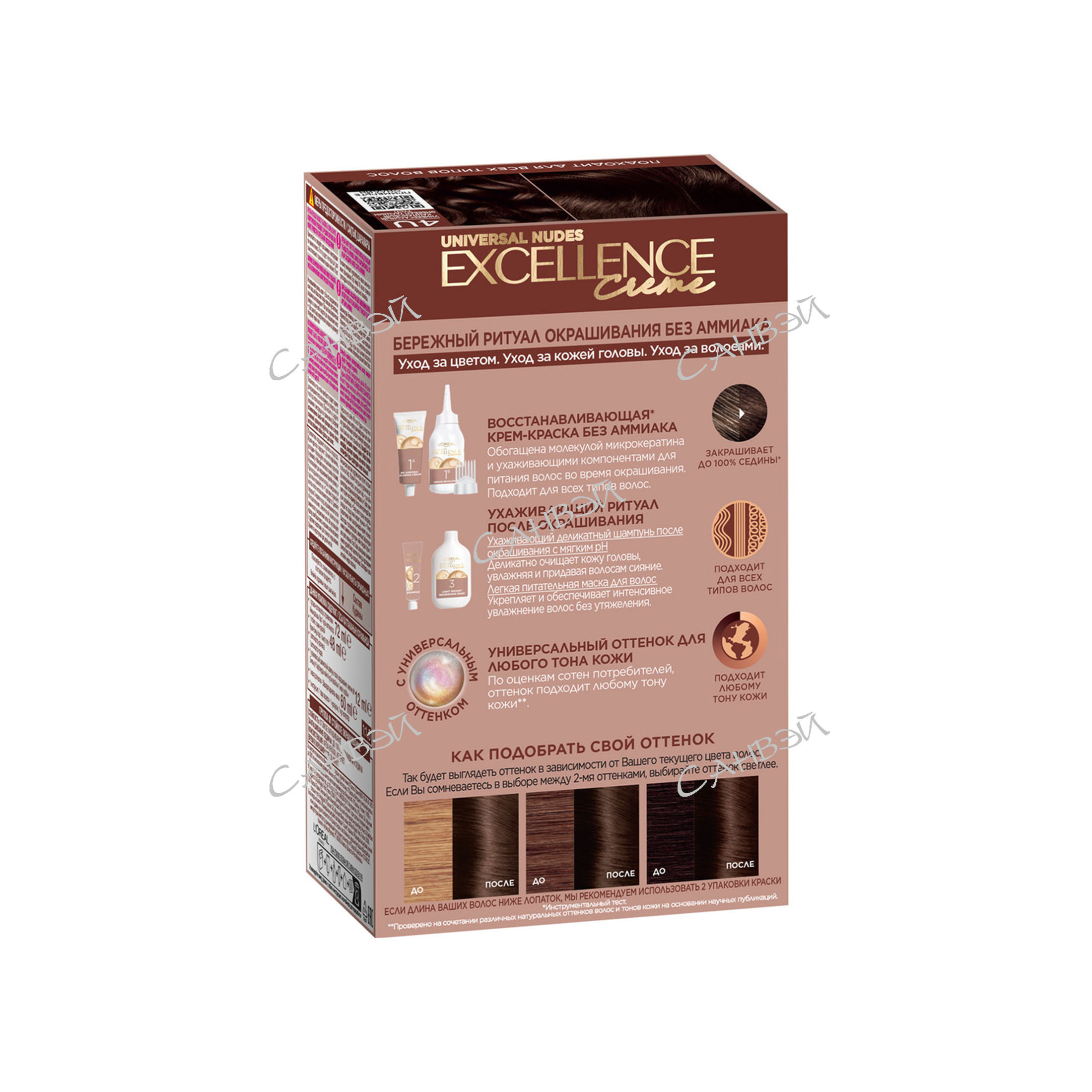 L'Oreal Paris, Стойкая крем-краска для волос без аммиака Excellence Nudes, оттенок 4U, универсальный каштановый из магазина Санвэй с тройным уходом: за цветом, за кожей головы, за волосами.