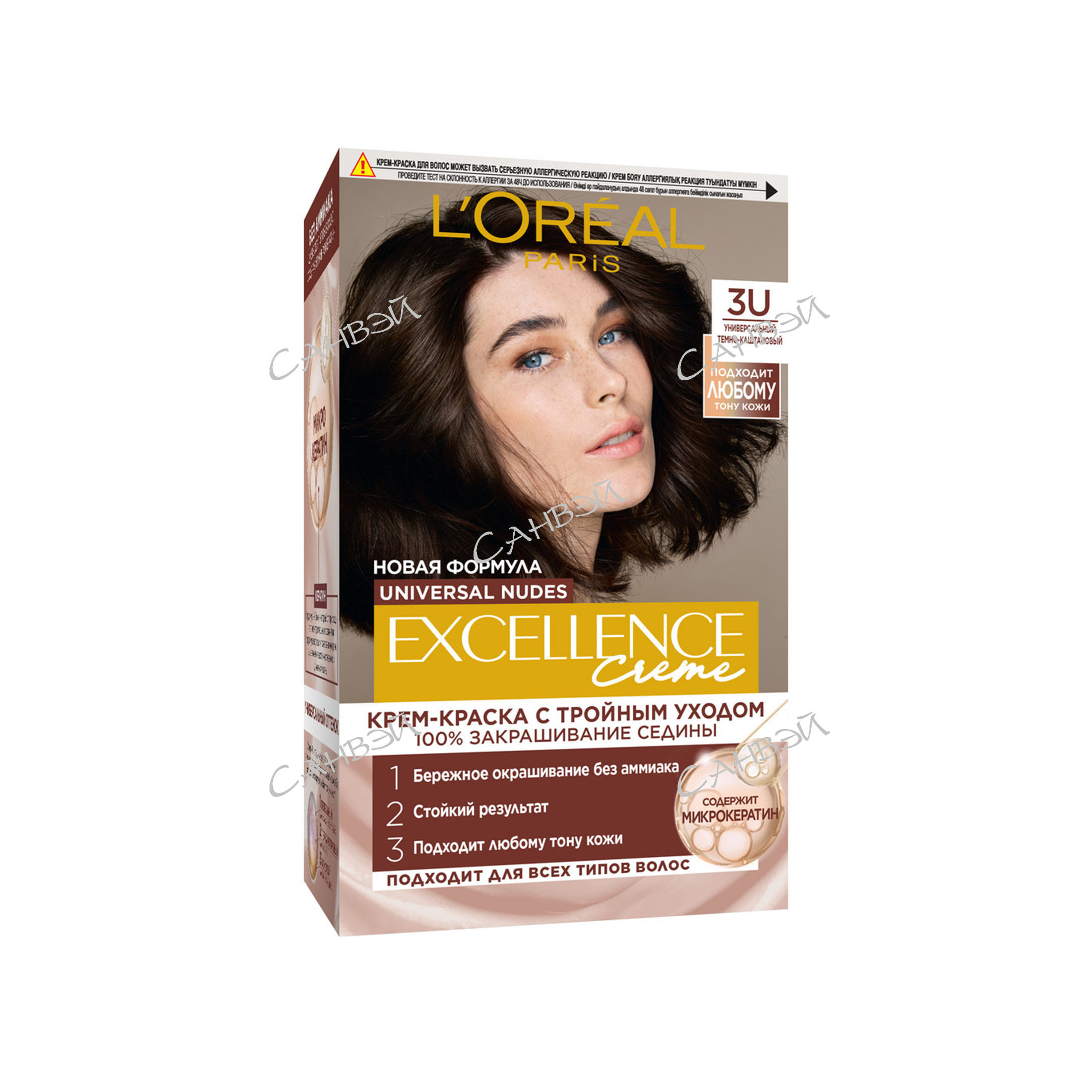 L'Oreal Paris Стойкая крем-краска для волос без аммиака Excellence Nudes, оттенок 3U, универсальный темно-каштановый из магазина Санвэй с тройным уходом: за цветом, за кожей головы, за волосами.