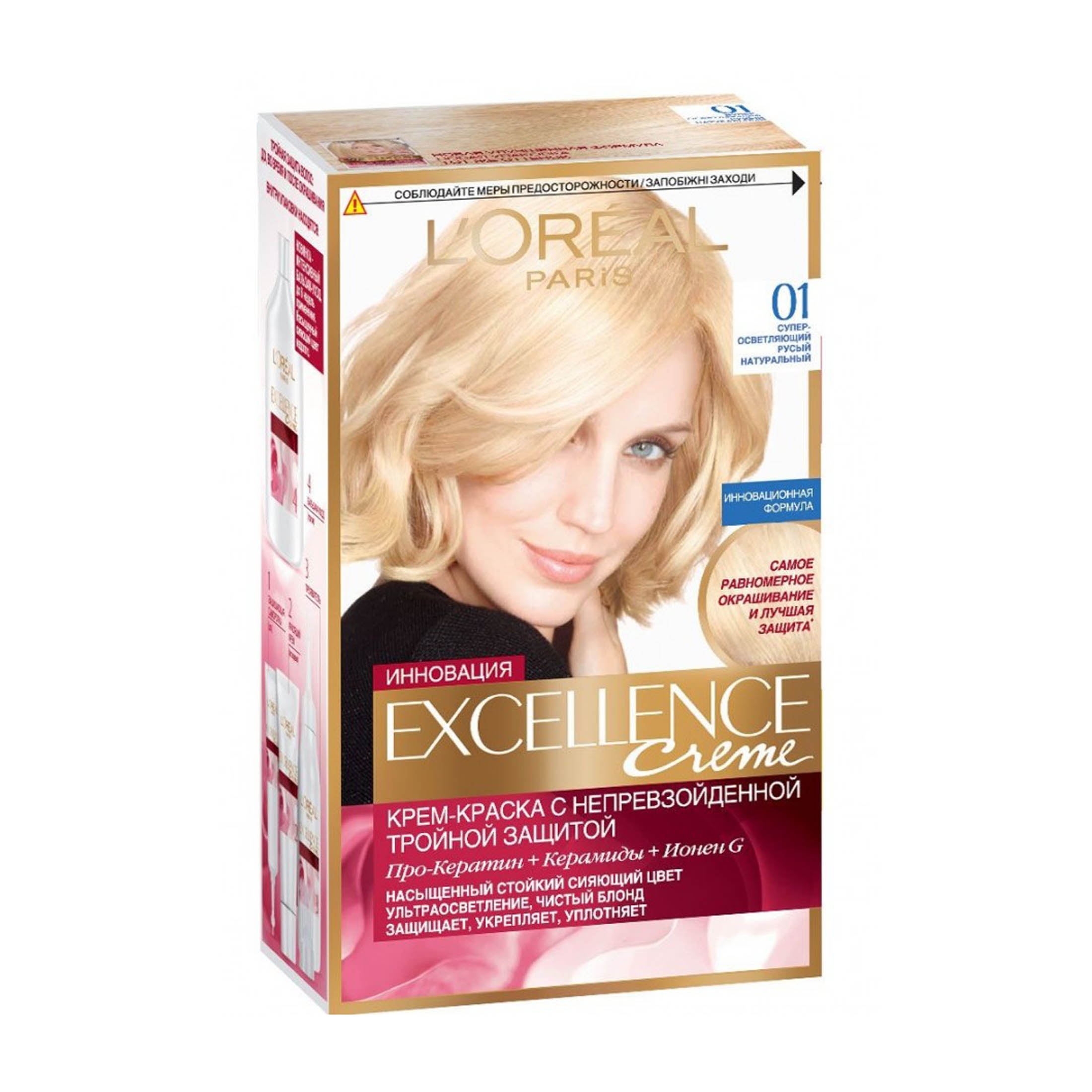 Стойкая инновационная крем-краска для волос L'Oreal Excellence, оттенок 01, суперосветляющий русый натуральный из магазина Санвэй для ультраосветления до 4 тонов. Защищает во время окрашивания. 100% закрашивание седины.