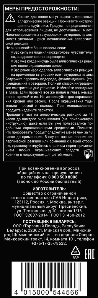 Согласно инструкции. Продукт не предназначен для использования лицами, не достигшими 16 лет. После окрашивания тщательно промойте волосы. При нанесении краски пользуйтесь перчатками. Провoдите тест на аллергическую реакцию за 48 часов до каждого окрашивания.