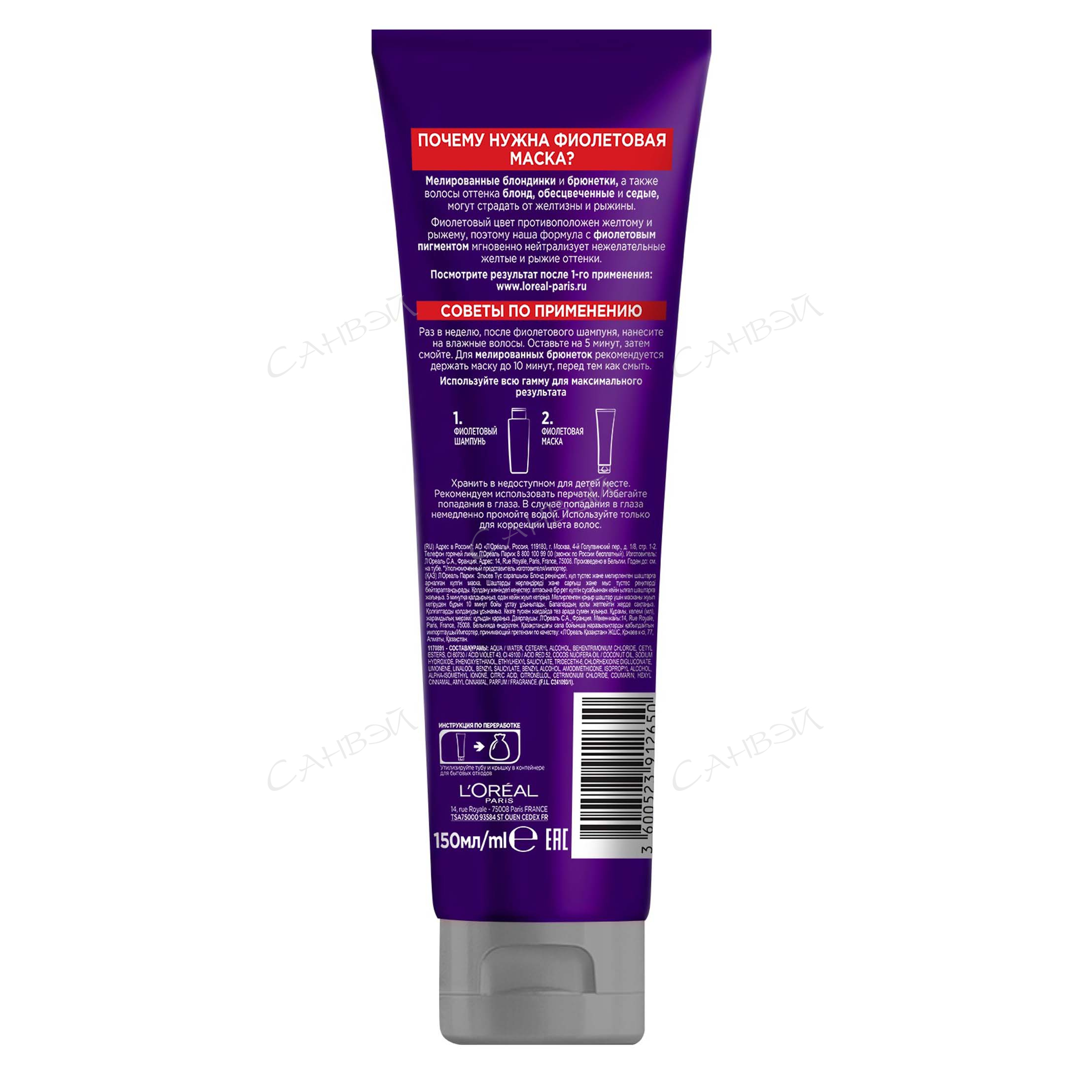 L'Oreal Paris Фиолетовая Маска Elseve, Эксперт Цвета для волос оттенка блонд и мелированных брюнеток, против желтизны, 150 мл из Санвэй: мелированные блондинки и брюнетки, а также волосы оттенка блонд, обесцвеченные и седые, могут страдать от желтизны и рыжины. Фиолетовый цвет противоположен желтому и рыжему, поэтому формула с фиолетовым пигментом мгновенно нейтрализует нежелательные желтые и рыжие оттенки, бережно очищая волосы. Фиолетовая маска Elseve питает волосы и нейтрализует желтые и рыжие оттенки.