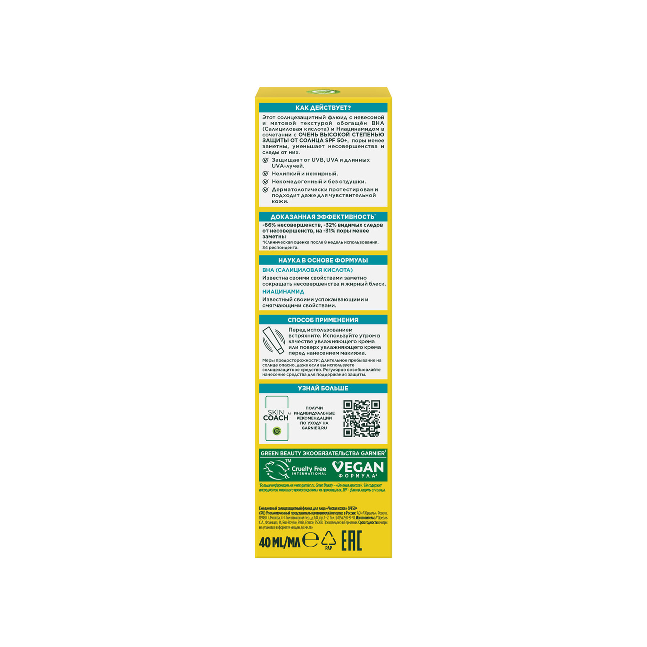 Garnier Чистая Кожа Ежедневный матирующий солнцезащитный флюид из Санвэй тот солнцезащитный флюид с невесомой и матовой текстурой обогащён ВНА (Салициловая кислота) и Ниацинамидом в сочетании с ВЫСОКОЙ СТЕПЕНЬЮ ЗАЩИТЫ ОТ СОЛНЦА SPF50+, поры менее заметны, уменьшает несовершенства и следы от них.