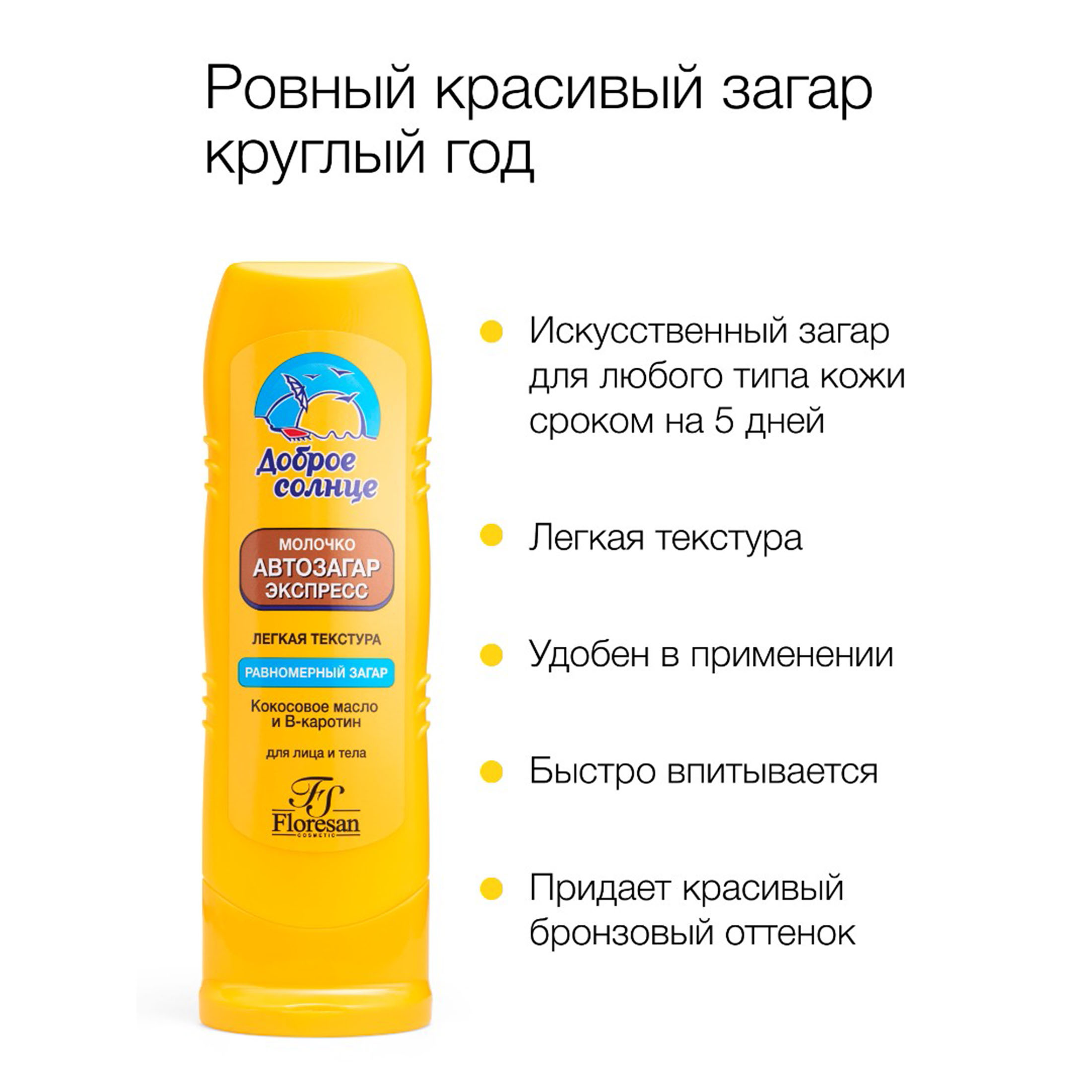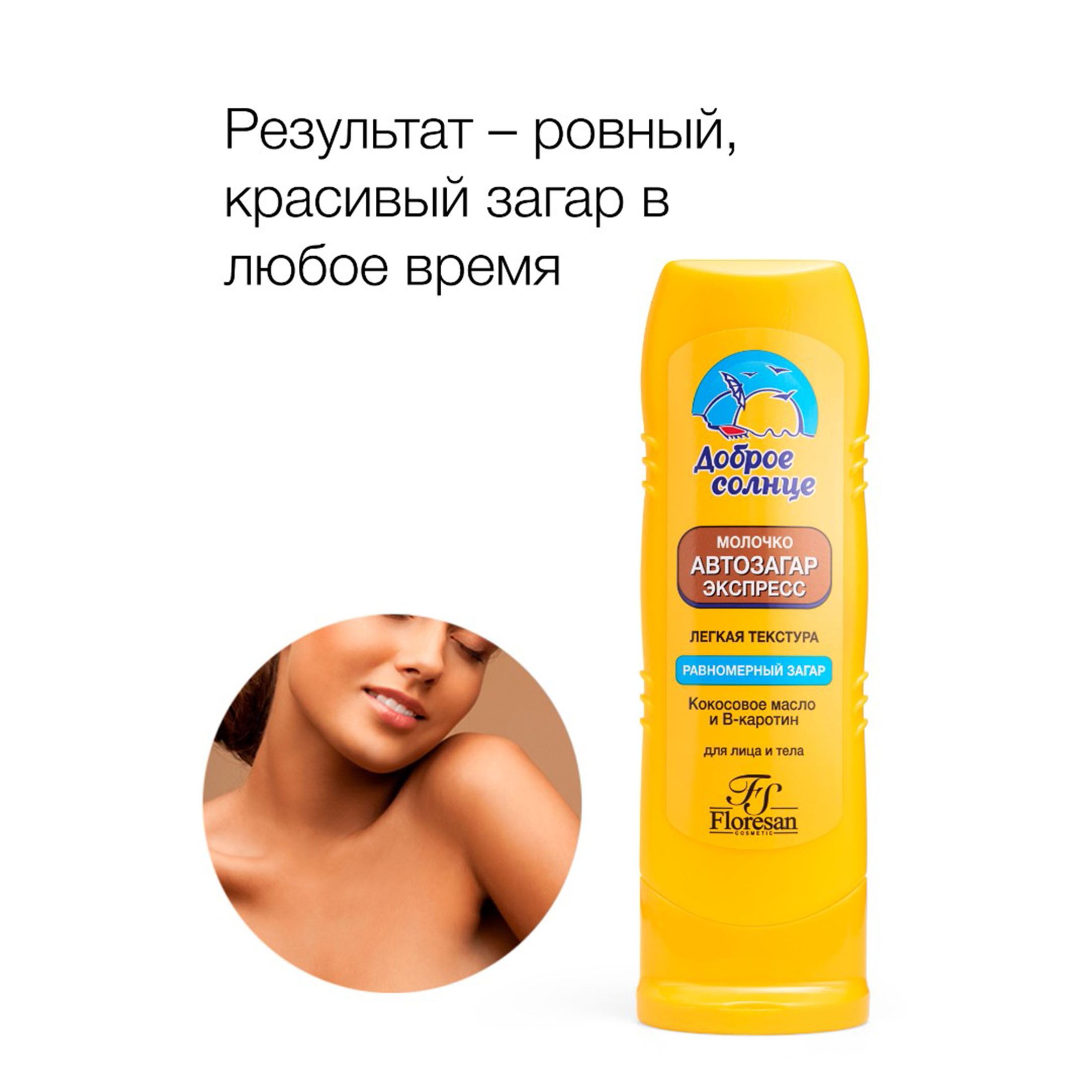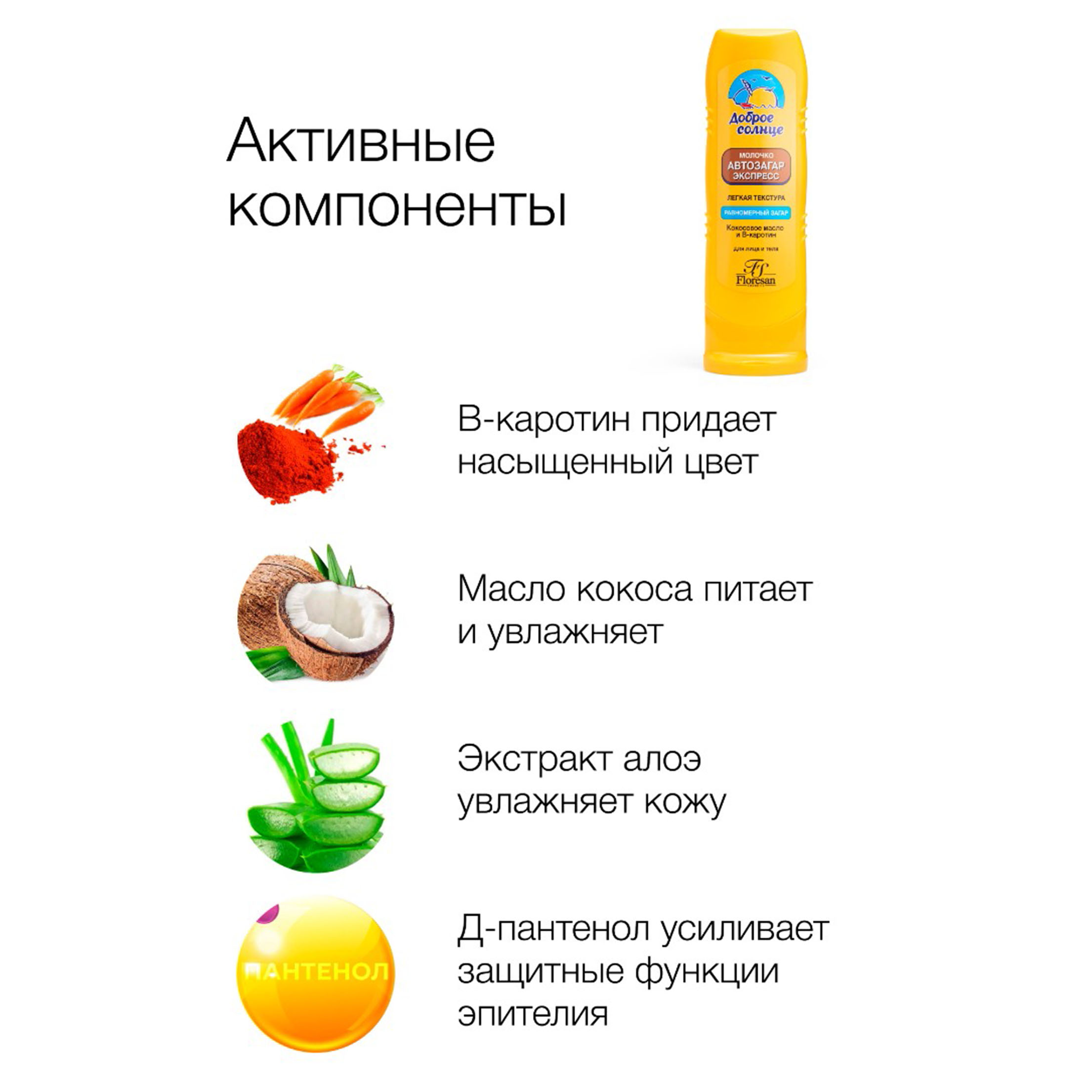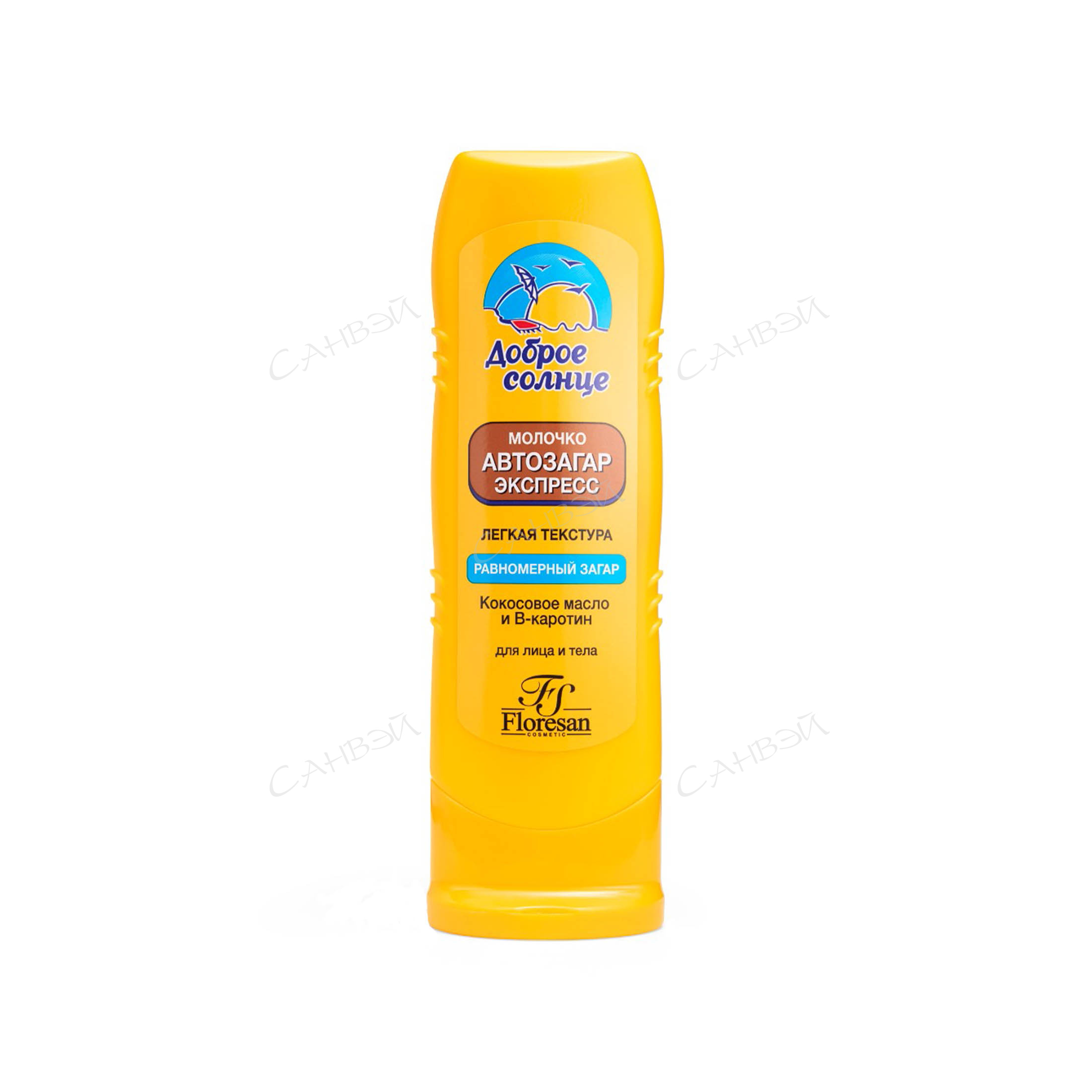 Флоресан Молочко автозагар экспресс 125мл Ф-110 из магазина Санвэй предназначается для получения искусственного загара лица и тела для всех типов кожи. Через 3-4 часа после нанесения молочка кожа приобретает цвет естественного загара, стойко сохраняющегося сроком до 5 дней. Молочко может применяться для маскировки локальной депигментации кожи. Рекомендуется использовать в комплексе с Крем - гелем для сохранения загара (формула 109) с целью продлить загар и сделать его более ровным.