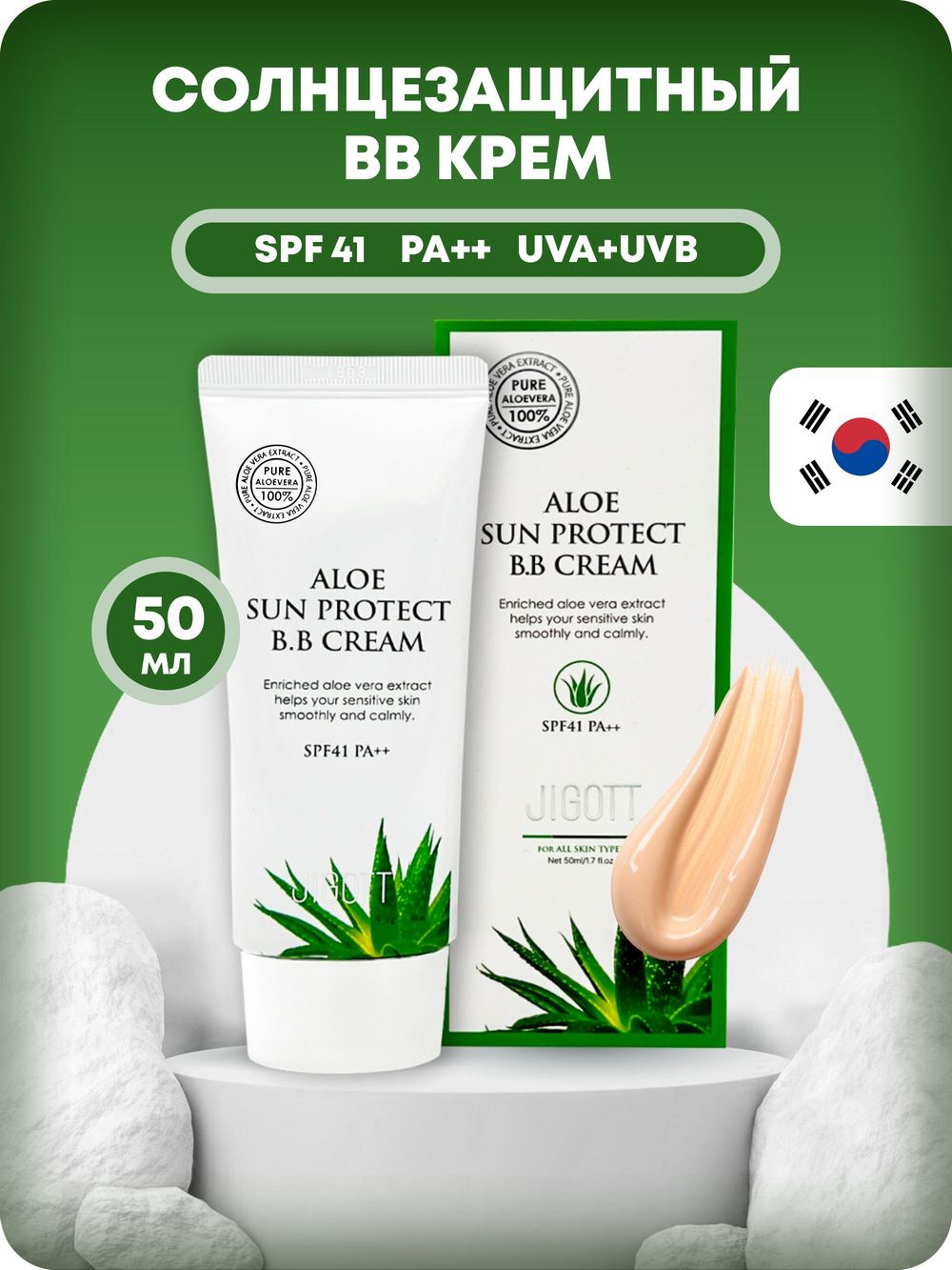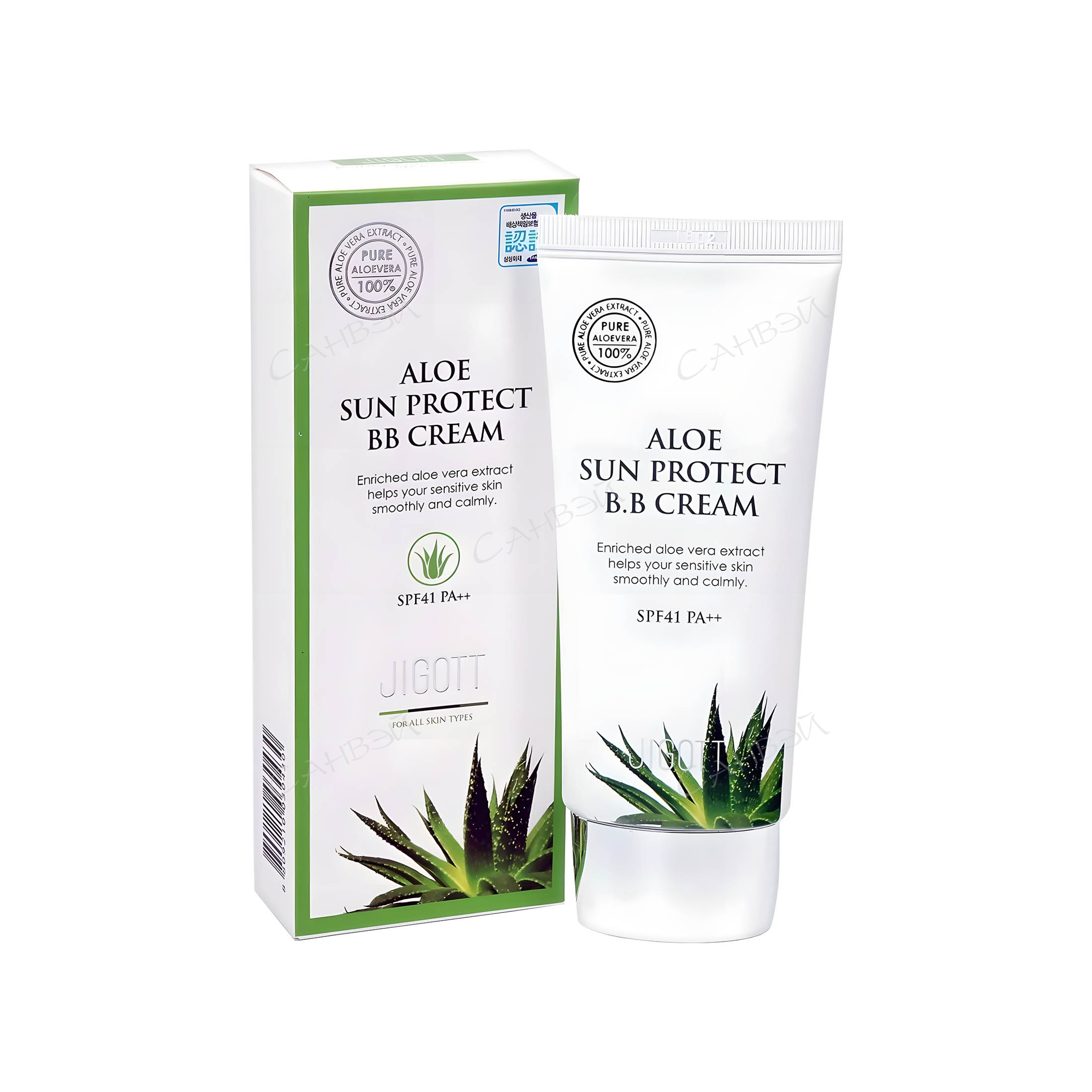 Jigott BB Крем для лица Солнцезащитный, С экстрактом Алоэ, SPF41/PA++, 50 мл - это многофункциональный ВВ-крем с экстрактом алое эффективно увлажняет и успокаивает кожу, маскирует несовершенства кожи, создает ровное красивое покрытие и защищает от ультрафиолета.