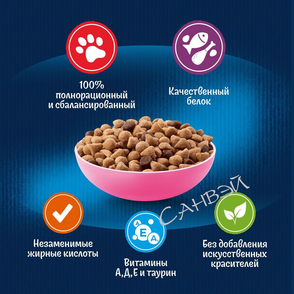 Сочетает два вида текстур: вкусные хрустящие гранулы и мягкие и нежные кусочки для полноты вкуса. Является полнорационным и содержит все необходимые для Вашего питомца ингредиенты.