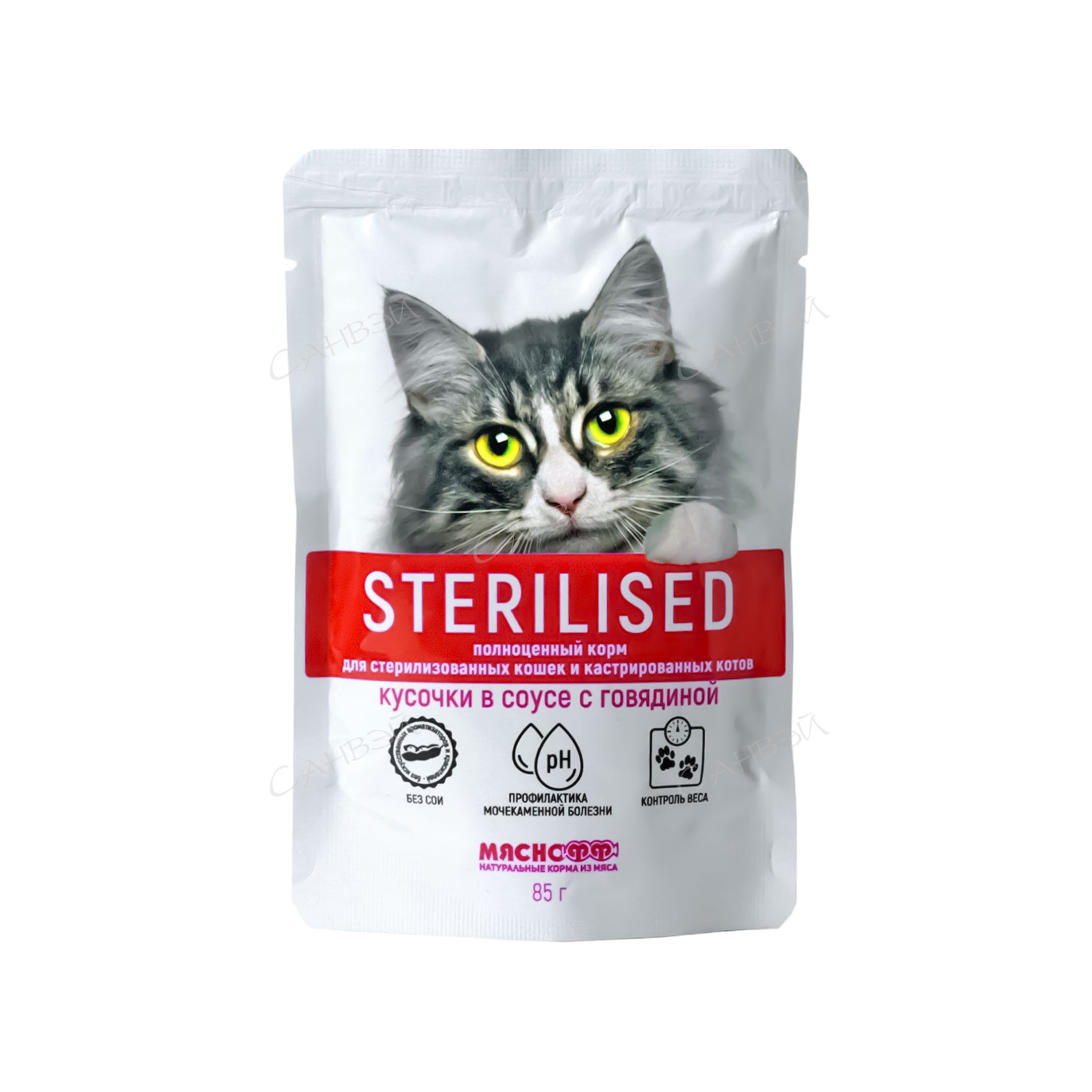 Мяснофф Sterilised Корм влажный Кусочки в соусе с говядиной для стерилизованных кошек 85 гр создан на основе рекомендаций по кормлению стерилизованных кошек и кастрированных котов с учетом их физиологических особенностей.