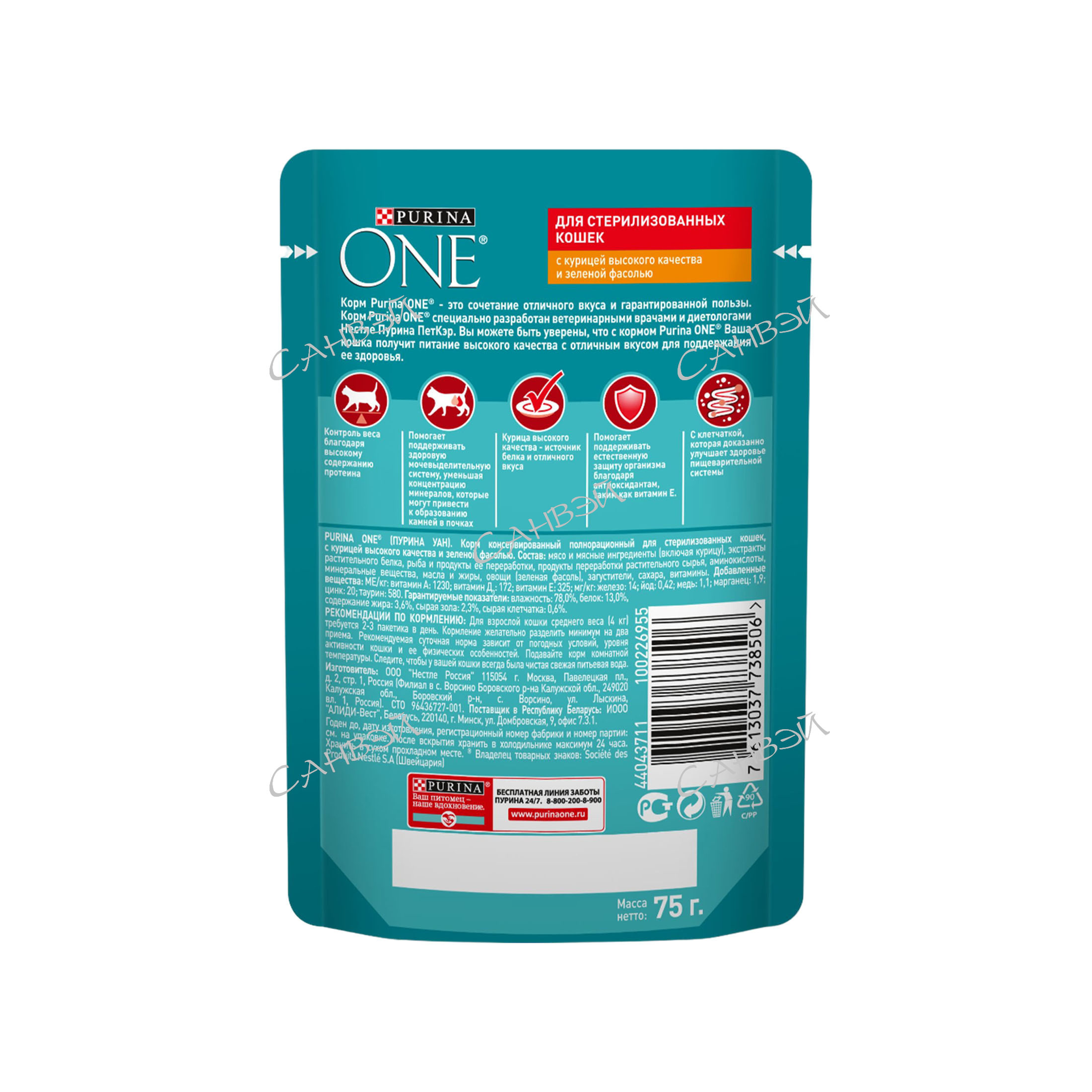 One Корм влажный для стерилизованных кошек с курицей 75 гр разработан экспертами Purina с учетом потребностей животных после стерилизации. Поддерживает здоровый обмен веществ и оптимальный вес питомца.