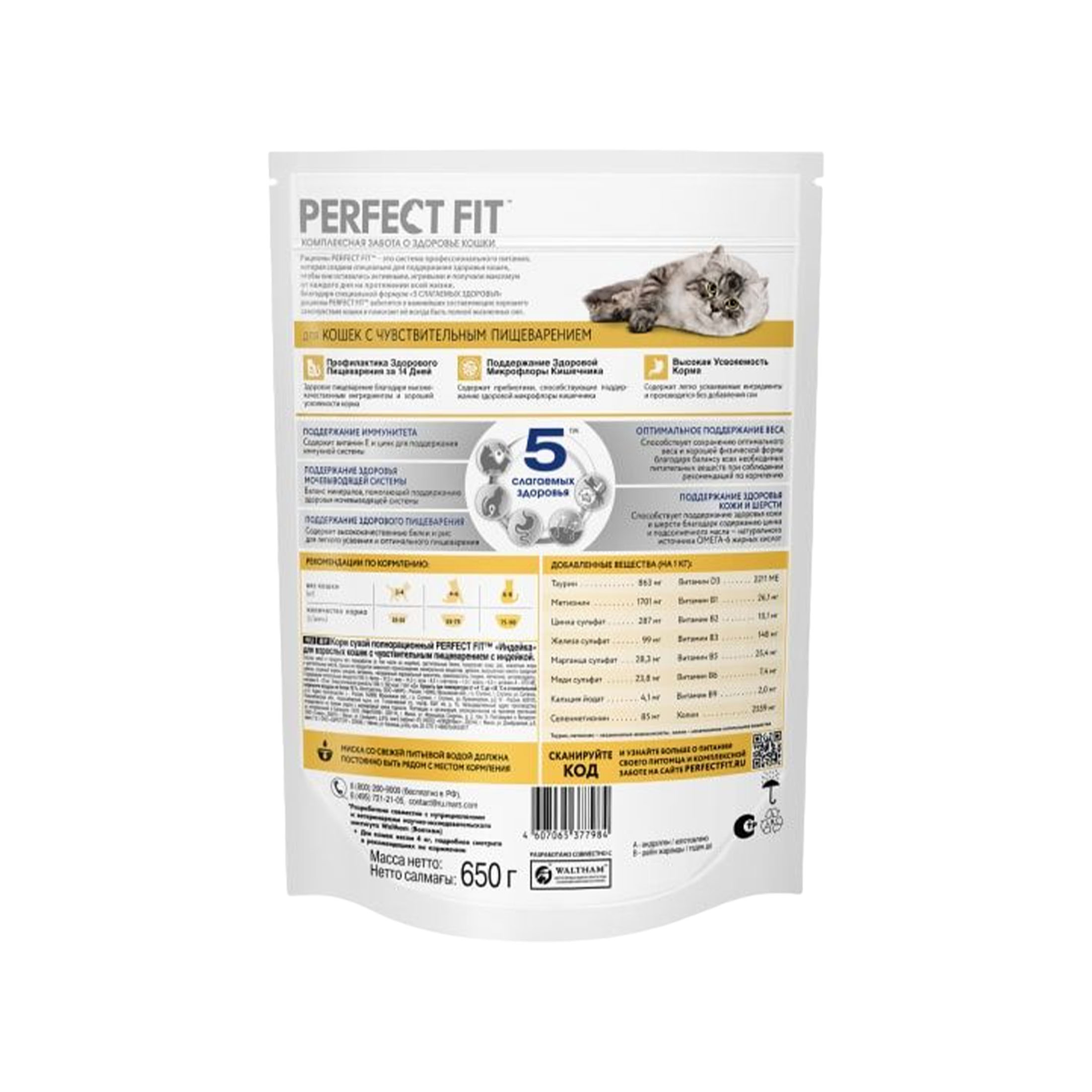 Perfect Fit Корм сухой для кошек с чувствительным пищеварением Подушечки с индейкой 650 гр адаптирован специально для кошек с особенностями пищеварения. Содержит пребиотики, способствующие поддержанию здоровой микрофлоры кишечника, и не содержит пшеницы и сои, которые могут вызвать дискомфорт в желудке кошки.