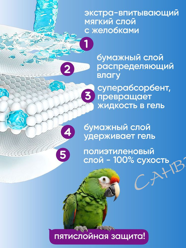 - Пеленка состоит из пяти слоёв: экстра-впитывающий мягкий слой с желобками, бумажный слой распределяющий влагу, суперабсорбент превращает жидкость в гель, бумажный слой удерживает гель и полиэтиленовый слой.
